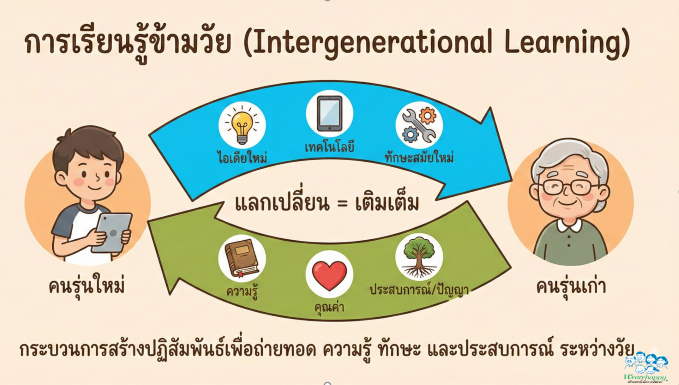 ลดช่องว่างระหว่างวัย การเรียนรู้ข้ามวัยช่วยให้คนต่างรุ่นได้เห็นแง่มุมความจริง เช่น มองว่าผู้สูงอายุล้าสมัย หรือมองว่าเด็ก Gen Z ขาดความอดทน