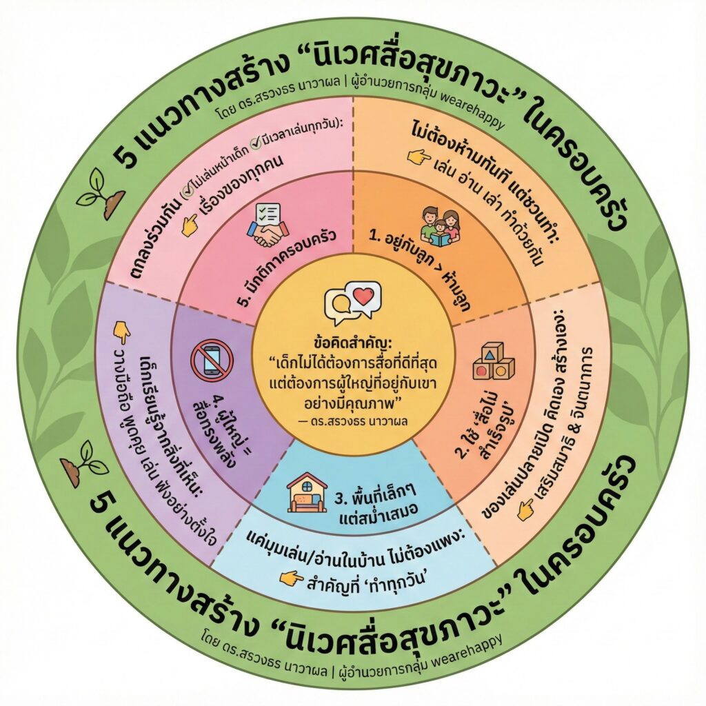 ดร.สรวงธร นาวาผล ผู้อำนวยการกลุ่ม wearehappy และผู้ร่วมพัฒนาแนวคิดนิเวศสื่อสุขภาวะ ให้ข้อเสนอแนะต่อครอบครัวที่ต้องการส่งเสริมพัฒนาการเด็กปฐมวัย ดังนี้